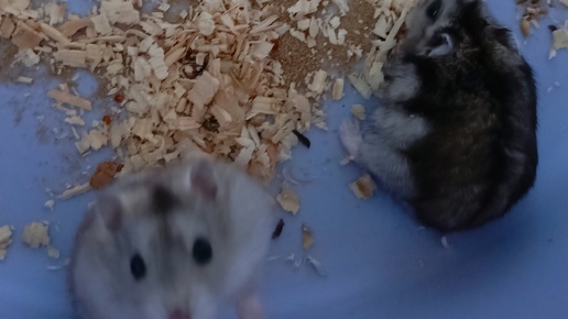 У них всегда есть вода, но вот корм начали убирать из клетки, потому что новые жители стали уже чересчур толстоватенькими...