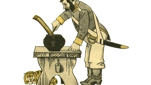В сборнике А. Н. Афанасьева «Народные русские сказки» (т. 3, 1855) есть сказка, которая называется «Солдатская загадка». Сюжет её таков. Идут прохожие солдаты и останавливаются у одной старухи на ночлег. Просят пить да есть. Однако старуха им отказывает. Мол, нету ничего. Тем не менее, в печи в горшке, под сковородой, у неё был варёный петух. Солдаты «это дело смекнули»; «один – вороватый был» - вышел во двор и раздёргал воз со снопами. После чего вошёл в избу и поведал старухе, что, мол, скот там во дворе, хлеб ест...