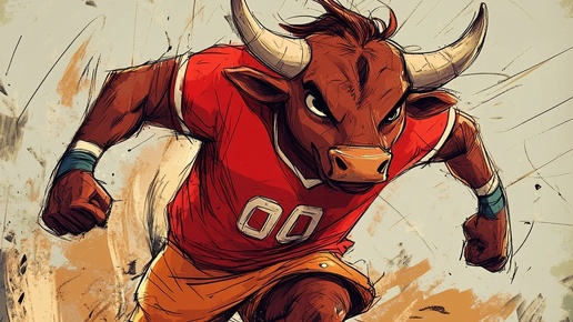 Создано на основе запроса: A hand-drawn, cartoon-style illustration of an energetic anthropomorphic bull playing soccer. The bull wears a red jersey and shorts with the number 00, showing intense focus and dynamic motion. It is mid-action, dribbling a soccer ball down a field with powerful strides, dust and energy lines trailing behind. The background features light sketch-style graffiti and motion effects, emphasizing speed and aggression...