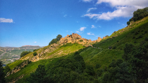 Всем привет! Гуниб остался позади, как и ровные дороги. Впереди узкая трасса с великолепными видами. Периодически встречаются обвалы, которые оперативно расчищают. Со встречным автомобилем разъехаться никак не выйдет. Солнце жарче, серпантины круче, дороги почти нет. Поворот, другой и вот уже последний. Стоянка у горной реки. А дальше? Наш гид расстелил коврик на берегу и уснул. Дальше пешком. Или... Немного посовещались, мчим на УАЗе. Камни летят в разные стороны, пыль столбом. Дагестанские горки) - Где же Гамсутль? - Вверху! Снова подъем, теперь уже пешком...