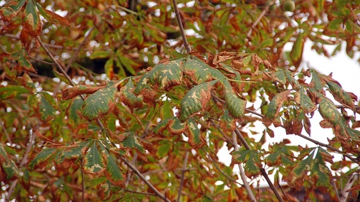 Не знаю, о чем я думала, когда сажала каштан на участке. Но факт уже свершившийся: каштан цветет и плодоносит. И размер имеет метров 7 в высоту. Но год назад я уже хотела его спилить от безысходности: листья к июню были в коричневых пятнах, к июлю пятнистость покрывала уже большую часть листовой пластины. Всему виной каштановая моль. Бич городских каштанов. Ну и залетевшая каким то образом и ко мне. Бытует мнение, что если собрать листья, то моль не перезимует. Я как правильный садовод осенью выгребала все до последнего листочка, трамбовала в черные мешки и увозила на помойку...