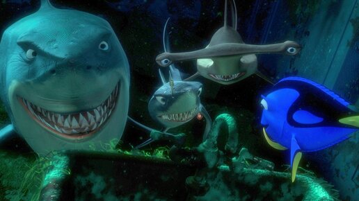 В поисках Немо. Маленькая зелёная рыбка на собрании акул уходит, чтобы позже съесть Дори и Марлина. И не единожды...