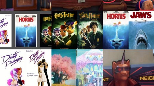 Отсылки, конечно, не всегда заметны, но они тоже нужны. Они повышают интерес к проекции. В мультфильме "Мой маленький пони: новое поколение" они тоже есть. 1. Самая явная: шестерка из "Дружба - это чудо" 2. Карта Эквестрии со знаками отличия шестерки 3. Колокол Грогара, Старсвирл Бородатый и след Спайка Я всё удивляюсь, как древняя картина Старсвирла сохранилась за столько лет? 4. Три фильма: "Dirty prancing", "Horns" и "Гарри Троттер" Эти три фильма являются отсылкой к реально существующим фильмам...
