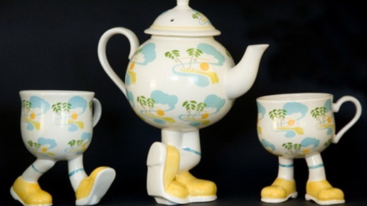 Помните сказку Корнея Чуковского "Федорино горе"? Там бабушка Федора была неряхой, дома у неё было грязно, посуду она не мыла, и вот чашки, ложки, стаканы, чайники, сковородки, поварёшки убежали от такой хозяйки. На днях, увидев представленное ниже фото посуды с ножками, я сразу вспомнила знакомые с детства строки Чуковского. "Вот и чайник за кофейником бежит,
