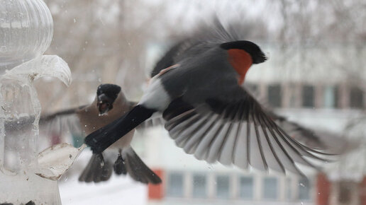 Казалось, птицы на нашей кормушке устроили бои без правил, однако в процессе наблюдения выяснилось, что далеко не все участники баталии действуют хаотично. Войнушку развязали озорники-воробьи, явившиеся к столу без приглашения. Обычно ленивые воришки до нашего окна не долетают – их и внизу неплохо кормят. Но то ли санкции ударили по кошельку соседей, то ли они не ожидали возврата зимы и перестали подкармливать своих питомцев... Так или иначе, а вся эта чирикающая шайка-лейка перекочевала в нашу "столовую"...