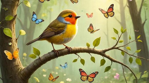 Птичка которая не умела петь В густом лесу, где пели птицы, жила маленькая птичка по имени Чирик. Все ее братья и сестры пели красивые песни, но Чирик никак не мог научиться петь. Когда он пытался, из его клюва вылетали только странные звуки. Чирик очень расстраивался. Он любил слушать пение других птиц и мечтал петь так же красиво. Однажды он увидел старого соловья, который сидел на ветке и пел чудесную мелодию. «Господин Соловей,» – робко сказал Чирик. «Я не умею петь. Помогите мне, пожалуйста...