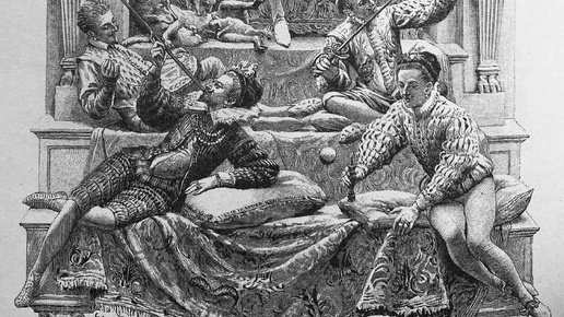 Вот мы и дошли до этой замечательной темы. Что интересно, иллюстрация привольной жизни миньонов (та, что в шапке заметки) открывает первую же главу. И это четвертая иллюстрация романа. Три предыдущие относятся к любовной линии романа. А жизнь миньонов и короля Генриха в иллюстрации из начала первой главы нам показаны, как блаженное ничего неделание. Что, конечно, не совсем так. Но именно так их жизнь представляли: собачки, вышивки, сарбакан и прочие развлечения... П ведь надо еще отстаивать дело короля...