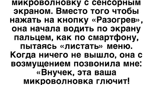 1. Битва с техникой Моя бабушка решила «освоить» новую микроволновку с сенсорным экраном. Вместо того чтобы нажать на кнопку «Разогрев», она начала водить по экрану пальцем, как по смартфону, пытаясь «листать» меню. Когда ничего не вышло, она с возмущением позвонила мне: «Внучек, эта ваша микроволновка глючит! Ничего не листается!» Пришлось ехать и объяснять, что не вся техника поддерживает «свайпы». 2. Не тот момент Решил сделать романтический подарок жене — заказал гравировку на её любимой кружке...