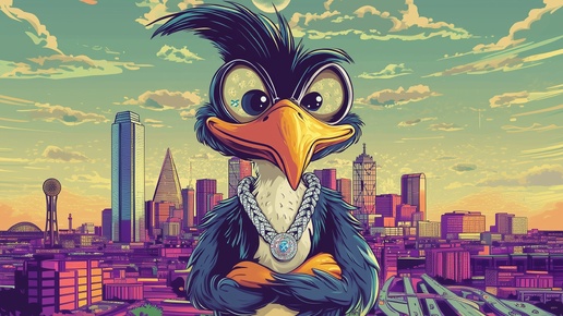 Создано на основе запроса: vectrs ilustration, I want a big head roadrunner cartoon character with a diamond chain With a Xanax and RR Royce rolls symbol as the pedants, With Dallas skyline in back,comic book style, --- Автоперевод: Векторная иллюстрация, я хочу большой...
