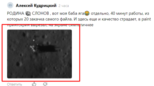 Рубрика "Главное - верить!". Вот уважаемый моглик (уважаемый - потому что ведёт себя культурно) Алексей Кудрицкий верит. Или даже верует. И, когда он это делает, ему открываются глаза - может быть, даже третий глаз - и он видит то, чего не может ни при каких обстоятельствах увидеть человек с менее крепкой верой. Например, на фото, якобы сделанных славным зондом Индийского космического агентства (ISRO) по имени Чандраян-2, он увидел следы преступления прилунения американских Аполлончиков. Алексей...