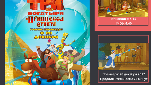 Предлагаю вашему вниманию мультипликационные картины российского производства, которые собрали самую большую кассу в нашем прокате. 6. Три богатыря и принцесса Египта В новогоднюю ночь, в то время, как Князь готовится произнести торжественную речь, а Юлий распаковывает подарки и следит за приготовлением праздничного стола, богатыри едут в гости к Алёше и встречают там странного товарища по имени Дурило. Оказывается, это тринадцатый месяц, который никому особенно не нужен, и который пытается осуществить своё заветное желание — стать самым главным месяцем в году...