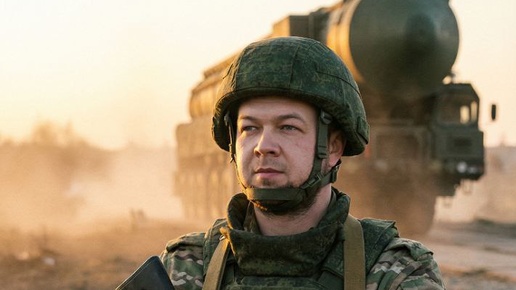 Промпт от подписчика Используй загруженное фото для лица мужчины — точно сохрани ВСЕ черты. Волосы и прическа строго как на фото. РАКЕТНЫЕ ВОЙСКА СТРАТЕГИЧЕСКОГО НАЗНАЧЕНИЯ. Мужчина в новой полевой форме Русской армии (мультикам, бронежилет, шлем), без нашивок и надписей, только небольшой флаг РФ на рукаве. Локация — военный полигон на закате, на заднем плане Межконтинентальная Баллистическая Ракета Тополь-М и дымка. Ракурс: средний план, мужчина стоит вполоборота, опираясь рукой на автомат, взгляд направлен вдаль...