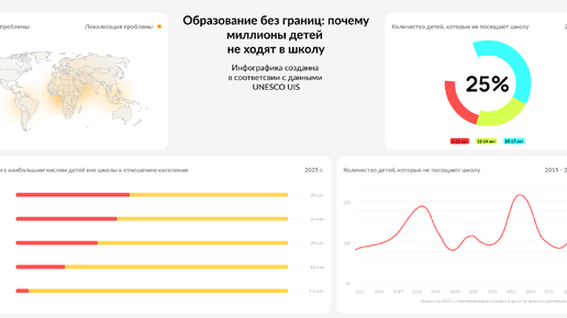 Масштаб глобальной проблемы Для каждого из нас образование является большой и очень важной частью жизни, к сожалению огромное количество детей лишены этого. По данным ЮНЕСКО, сегодня около 250 миллионов детей и подростков не посещают школу. Это значит, что каждый пятый ребёнок школьного возраста не получает базового образования. Особенно тяжёлая ситуация наблюдается в странах с низким уровнем дохода. Больше всего детей, не посещающих школу, живут в пяти странах: Индия, Пакистан, Нигерия, Эфиопия и Нигер...