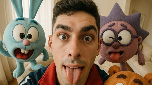 Делаем селфи с любимыми персонажами из мультфильмов Промт: Ультрареалистичное селфи в вертикальном формате 9:16 с эффектом “рыбьего глаза”: я с Губкой Бобом, Патриком, Сквидвардом и Сэнди. Все корчим дурацкие рожицы...