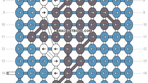 Есть два вида схем для плетения фенечек: косое и прямое плетение. В косом плетении, задействованы все нити и плетётся она "сеточкой". В данном случае мы нарезаем нужное кол-во ниточек, раскладываем по той очередности, как они на схеме наверху (зеленый, желтый, голубой и т.д.), и соответственно плетем. А вот пример схемы прямого плетения. Мы плетем только одной ведущей нитью фона, остальные цвета вплетаем, а нити основы могут быть совершенно любые, желательно конечно подбирать под фон...