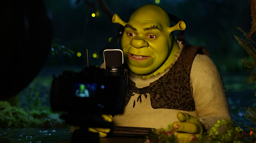 Тёмный лес, редкие лучи солнца пробиваются сквозь густые кроны. Шрек сидит на пне с микрофоном и камерой, стараясь говорить тихо и расслабленно. 🗣️ Шрек (шёпотом):
