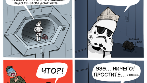 Имперские штурмовики являются настоящим символом франшизы «Звездных войн» - белая броня и защитный шлем до сих пор остаются одним из самых узнаваемых образов в кинематографе. А еще именно в честь солдат, придуманных Джорджем Лукасом, назван термин «синдром штурмовика» - когда обученная армия злодеев оказывается абсолютно беспомощна перед лицом главных героев фильма. Конечно же, такой узнаваемый образ, как штурмовик просто не мог не стать предметом многочисленных фанатских юмористических комиксов...