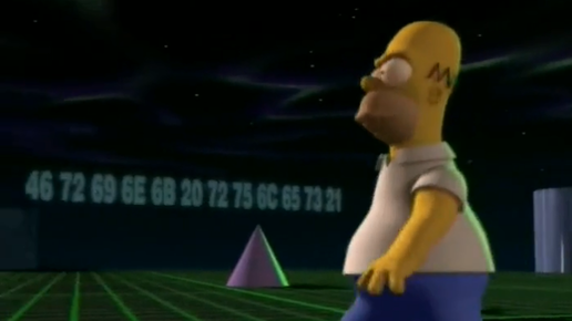 Самую яркую, на мой взгляд, пасхалку в Симпсонах (по крайней мере, очень оригинальную) я показала вам в одной из прошлых статей¹. Там же я спросила ваше мнение насчет статьи с другими пасхалками. Вот результат: Вы проголосовали, я сделала. Смотрим подборку пасхалок в Симпсонах. Frink rules! Начнём с пасхалочки для тех, кто неплохо разбирается в программировании, кодировании или просто в системах счисления. Мне она очень нравится. В специальном выпуске к Хэллоуину в 7-м сезоне Гомер попадает в трехмерное измерение...