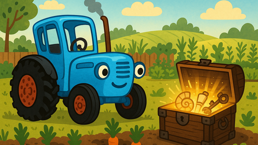 На весёлой зелёной ферме жил-был Синий Трактор. Каждый день он с утра до вечера помогал друзьям: поливал грядки, возил сено, возил детишек кататься и пел свои весёлые песни. «Я Трактор синий — не грущу, Всех на ферме я люблю! Если где беда, зову — Сразу мчусь я на подмогу!» И вот однажды, после сильного дождя, когда солнышко только выглянуло из-за туч, Хрюша заметил что-то блестящее в огороде. — Трактор! Иди скорей! Что-то торчит из земли! Синий Трактор подъехал — и увидел уголок чего-то деревянного...