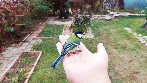 Спасенная людьми синица не хотела расставаться с сытой жизнью: но свобода оказалась привлекательнее