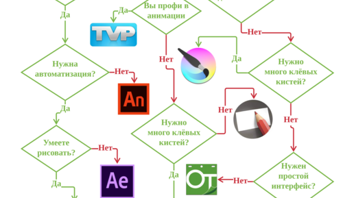 11 лет я рисую мультфильмы на компьютере и за это время перепробовал массу программ. Как платных, так и бесплатных. Сегодня я расскажу о лучших из них и как выбрать из этого немаленького списка. Согласитесь, даже от неполного списка глаза разбегаются. Чтобы собрать их обратно и определиться с программой, предлагаю вам пройти простой тест. Как выбрать программу для анимации на ПК Просто пройдите сверху вниз по схеме и отвечайте на вопросы. Ответ приведет вас к программе вашей мечты. Запомните её логотип...