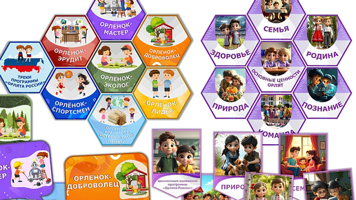 Орлята России. Новое оформление для стены, доски, класса, уголка и стенда. Материал: треки, флажки для растяжки, гексы, речевые облака. Готовый комплект шаблонов для распечатки и украшения класса, стенда, актового зала, стены или фойе в начальной школе. Всё выполнено в официальном стиле программы «Орлята России» и ориентировано на учеников с 1 по 4 класс! В комплект входят: Для информационного стенда: