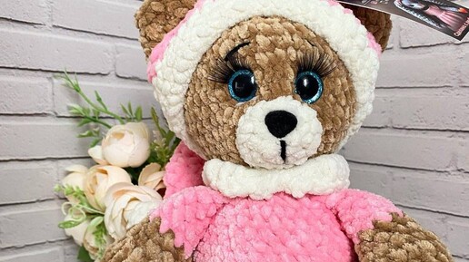 А сейчас я расскажу про "хит сезона". За последние три месяца эту игрушку в разных вариациях я связала 14 раз! В какой-то момент они мне начали сниться, когда я открывала сообщения с заказами - можно было спорить на ящик коньяка что там или заяц, или вот это... Это - Медведик! Как и зайцев, я их вязала в разных костюмах - в пижамах и платьях, в колпаках и беретах, в розовом и в голубом. И даже новогодние были))) А однажды пришел такой заказ - "Хочу такого же медведя, но панду"...
