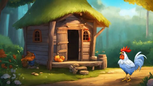 Сказка, про храброго петушка и злого волка. В одном лесу, на опушке, жил храбрый петушок. Он был не простым, а с золотым перышком в хвосте, которое приносило ему удачу. Жил петушок не один, а с курочкой Рябой и тремя цыплятами. Однажды повадился в лесу злой волк. Хитрый да зубастый, он решил съесть петушка с его семьёй. Раз утром пришёл волк к их дому и постучался в дверь. Курочка испугалась, а петушок расправил свои крылья и сказал: — Не бойся, Рябуша, я его прогоню! Волк зарычал и попытался сломать дверь...