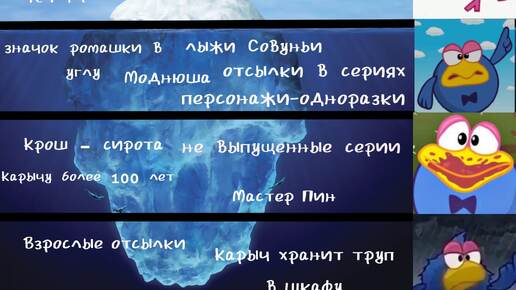 Вобщем сегодня я разберу самодельный айсберг по мультфильму «Смешарики». Ну чтож, начинаем! P.S. это мой первый айсберг. Начал его создание с 18.12.24, окончил 29.12.24. Это самая первая серия Смешариков, в которой присутствуют Крош, Ёжик и Бараш. От этой серии помолились и другие серии. Все это знают, поэтому этот пункт находится в верхушке айсберга. Как многие замечают - в каждой серии «Смешариков» присутствует философский подтекст. Мне больше нечего об этом добавить. Фандом в интернете, где я нашёл большу часть информации для айсберга...