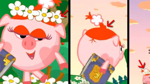 По традиции начнем с исчезновений. Известную практику не дорисовывать что-то, что уже не имеет сценарного веса, создатели «Смешариков» очень любят и постоянно используют. А потом берут и снова рисуют, что создает удивительную чехарду из предметов и их явлений. Вот одежда — венок на Нюше в третьей серии то есть, то нет, то снова есть. Кстати, вы знали, что ромашки изображены на гербе «Смешариков»? Символ дружбы и взаимопонимания, между прочим Шарф на Бараше в «Только никому не говори» — туда же. Бабочка Карыча определенно живет своей жизнью, например, в «Полосе невезения»...