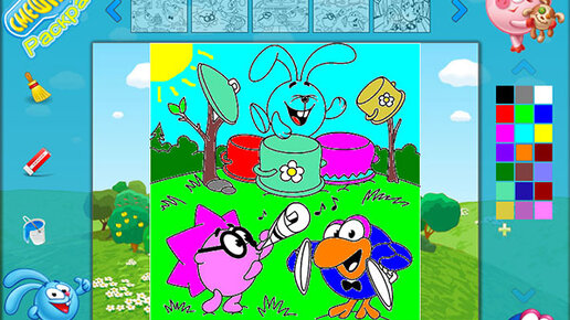 Программа «Раскрась Смешариков», не что иное, как детская раскраска только не на бумаге, а на компьютере, и вместо кисточек и карандашей дети раскрашивают мышкой картинки из известного мультсериала «смешарики».