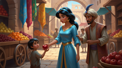 Я помню, как впервые заметила эту деталь в мультфильме. Жасмин выбегает из дворца, срывает яблоко с лотка и отдаёт голодному ребёнку. Торговец хватает её за руку, требуя заплатить. И она не кричит "Да я принцесса!", не зовёт стражу. Она растеряна, извиняется, пытается объяснить. Принцесса не умеет торговаться. Но умеет признавать свою ошибку перед человеком, которого видит впервые. Это странно, если подумать. Её учили церемониалу приёма послов, грации, умению держать спину. Но не научили главному...