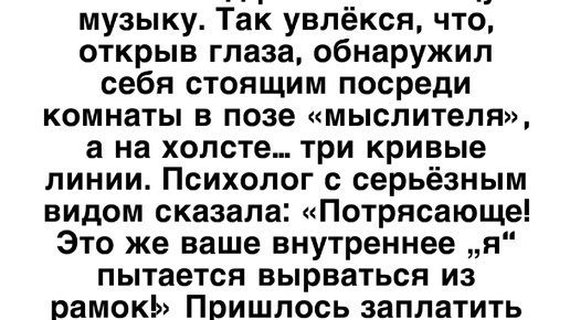 1. Сила искусства Друг решил снять стресс на сеансе арт-терапии — рисовал картину с закрытыми глазами под расслабляющую музыку. Так увлёкся, что, открыв глаза, обнаружил себя стоящим посреди комнаты в позе «мыслителя», а на холсте… три кривые линии. Психолог с серьёзным видом сказала: «Потрясающе! Это же ваше внутреннее „я“ пытается вырваться из рамок!» Пришлось заплатить за «шедевр». 2. Кухонная драма Решила приготовить домашний майонез. По рецепту нужно медленно вливать масло, непрерывно взбивая...