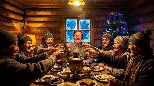 Рассказ Майка (Окончание, начало здесь: https://dzen.ru/a/aU0tZui0YXgRD7DU) Время близится к полуночи. Стол ломится от еды: оливье (мой авокадо так и остался в сторонке, как памятник культурному эксперименту), селёдка под шубой, розовое сало, квашеная капуста, соленые огурцы, горячие котлеты, мандариновые горы. Иван-Дед Мороз допивает чай из самовара, все укутаны в подаренные шарфы — деревня выглядит как вязаный спецназ. Я сижу в своём синем кедровом шарфе и думаю: "Netflix со своими сериалами просто отдыхает"...
