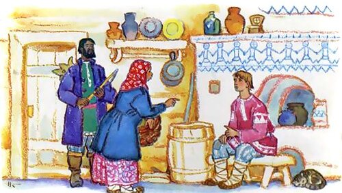 Нанял его в работники один мужик, а сам с женой собрался в город; жена...