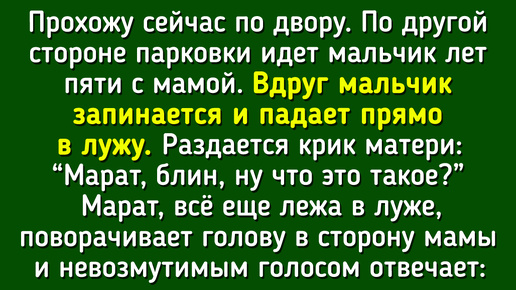 Марат, все еще лежа в луже, поворачивает голову в сторону мамы и невозмутимым голосом отвечает: