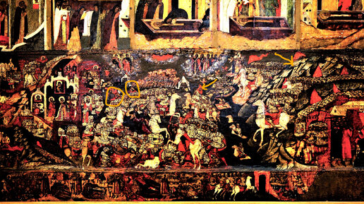 Куликовская битва на Куликовом поле, Дмитрий Донской против Мамая или Мамай против Донского, воины крутые ничего не скажешь что тот, что другой, только вот вопрос. Кто из них кто? На иконе явно видно, что воины и стой и с другой стороны одинаковые лицами, снаряжение тоже один в один и у тех и у других, стяги тоже одинаковые с изображением лика, похоже на битву против своих, брат на брата, гражданская война. Интересный ландшафт тут нарисован, речка через которую переправляется Мамай странно, а почему он через нее переправляется вроде должен Дмитрий смотрим схему Вот вам нестыковочка...