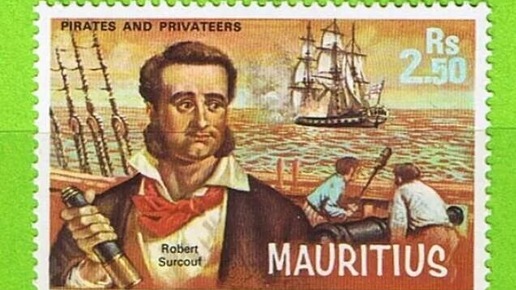На изображении представлена почтовая марка, выпущенная на острове Маврикий. На марке изображен Роберт Сюркуф, известный французский корсар и пират, который действовал в конце XVIII — начале XIX веков. Он прославился своими дерзкими нападениями на британские торговые суда в Индийском океане...