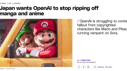 Правительство Японии хочет запретить OpenAI, в частности Sora 2, создавать аниме и мангу. Чиновники объясняют это решение нарушением авторских прав. Кроме того, они считают мангу и аниме «невосполнимыми культурными сокровищами». Подобные проблемы будут нарастать по мере появления новых генеративных моделей...