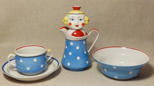 Советская фарфорово-фаянсовая отрасли выпускала огромное количество различной продукции – миллионы чашек, тарелок, сервизов различной комплектации Среди всего этого разнообразия нашлось место и для самых маленьких потребителей – детей. Для них разрабатывалась и выпускалась специальная детская посуда Детскую посуду так же как и взрослую, изготавливали из фарфора, фаянса и майолики. Отличались детские изделия миниатюрными размерами и меньшим количество предметов в наборе Чаще всего детские наборы были индивидуальны – рассчитаны на одного малыша...