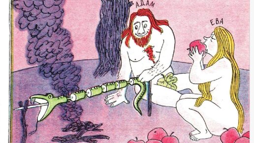Адам и Ева в карикатуре: жарят змея, варят сидр, работают