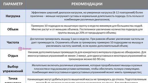 Приведем здесь обобщенные научные рекомендации по методическим параметрам силовой тренировки (интенсивность, объем и проч.) для максимизации мышечного роста. Так называемые "последние" научные данные на 2021 год (рис.1); Нагрузка: Эффективен широкий диапазон нагрузки, но умеренная нагрузка (8-12 повторений) более практична – меньше нагружает суставы и нормальная (не очень длинная) длительность подхода. Есть польза от комбинации различных диапазонов; Объем: Примерно 10 подходов на мышцу в неделю минимум для большинства людей...