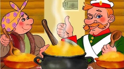 Старик шёл на побывку, устал. Дверь открыла старуха: – Пустите отдохнуть человека! Старый солдат входил и просил у старухи перекусить чего-нибудь ; она его угощала — так уж получилось, что он был сиротой (на самом деле старушка сама ещё ничего не готовила)...