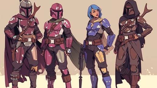 Создано на основе запроса: Mandalorian Male and Female Characters, Anime Cartoon Style Art, Reimagined Star Wars Mandalorians, Mix of Bright and Dull Armor Colors, Full Body Figures, Animation Model Sheet, --- Автоперевод: Мандалорские персонажи мужского и женского пола,...