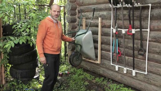 Храним тачку удобно, чтобы она никому не мешала и не занимала много места на участке. Возьмите доску, длина которой должна быть чуть больше ширины тачки. В нашем случае ширина тачки 55 см, соответственно ширина доски должна быть 60 см. Чтобы саморезы не раскололи брус, предварительно засверлите в нём отверстия. Также надо просверлить по два отверстия в каждом бруске для крепления конструкции в нужном вам месте. Вставьте доску между...