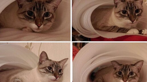 На шкафу валялся рулон утеплителя под ламинат. Кот Беляшик облюбовал в нем себе эксклюзивную лежку. Все требования безопасности для параноидальных котов соблюдены: тепло, сухо, два входа и трудно заметить внутри дрыхнущего кота. Но основную опасность для спящего Беляшика представлял сам Беляшик.
