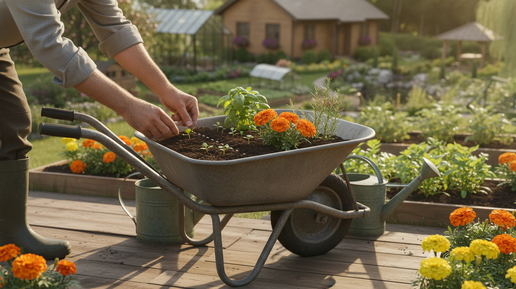 Старая тачка стояла за сараем, накрытая покривившимся куском рубероида. Колесо приспустило, корыто в двух местах зацвело рыжей ржавчиной, ручки шершавые от облупившейся краски. На весеннем солнце металл нагрелся, и прямо слышно было, как потрескивают старые слои. Мы с вечера решили — не списывать в металлолом, а дать ей вторую жизнь. Подремонтировать, засыпать землю, посеять зелень и сделать передвижной огород. Утром я выкатил тачку на свет, щётка по металлу завизжала в патине, запах грунтовки и свежей эмали смешался с сыростью земли — и работа пошла...