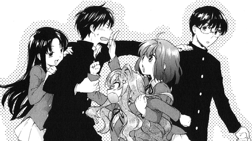 Немного общей инфы Жанр: романтика, повседневность, драма Выпускается с 2007 года, насчитывает 10 томов, выпуск продолжается Адаптация одноимённого ранобэ Ююко Такэмии. Сюжет Торадора это очень интересное произведение. С одной стороны сюжет досточно банальный- есть парень (почти ояш) Рюдзи, который снаружи грозный, но в душе очень добрый и есть девушка Тайга, которая снаружи очень милая, но со скверным характером , им 17 лет, они учатся в школе и конечно же влюблены :^) но не в друг-друга. Рюдзи мечтает о лучшей подруги Тайги -Минори...