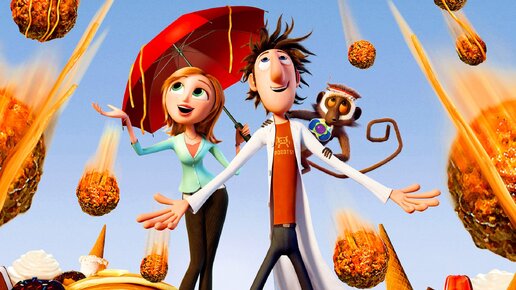 1 - Облачно, возможны осадки в виде фрикаделек(все части) Главный герой мультфильма - странный ученый Флинт Локвуд, который всегда хотел изобрести что-то такое, что сделает его родной городок счастливым. И вот, у него получилось! Еды теперь хватает всем, и она просто падает с неба, создавая новые пейзажи вокруг: можно любоваться закатом с живописных холмов из фруктового желе. Но иногда вкусные осадки в виде фрикаделек могут превратиться в настоящий торнадо из аппетитных, но уже опасных спагетти! Гениальному ученому и его друзьям предстоит исправить положение дел в сытом городке...
