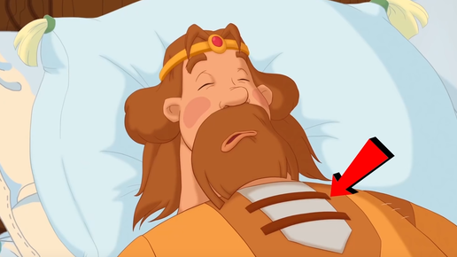 1. Добрыня Никитич и Илья Муромец ловят рыбу, верхняя одежда лежит рядом с ними. Но с в следующем кадре она таинственным образом исчезает. 2. Элементы одежды Князя тоже слегка видоизменяются. Посмотрите, на общем плане мы видим, что на его платье три завязки. Но на более крупном плане их всего две! 3. Дополнительные подушки, на которых лежит Князь, тоже, то пропадают, то появляются. 4. На общих планах мультипликаторы решили не утруждать себя лишней работой и просто создали огромное количество клонов! Распространенная практика: 5...